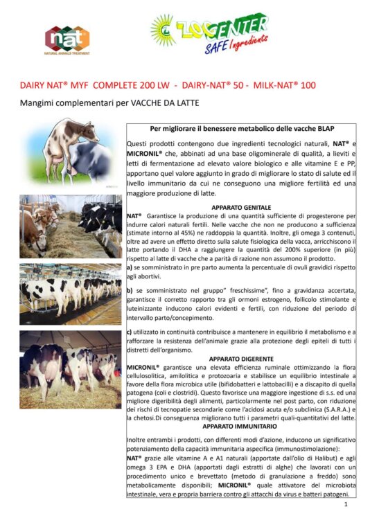Questi prodotti contengono due ingredienti tecnologici naturali, NAT® e MICRONIL® che, abbinati ad una base oligominerale di qualità, a lieviti e letti di fermentazione ad elevato valore biologico e alle vitamine E e PP, apportano quel valore aggiunto in grado di migliorare lo stato di salute ed il livello immunitario da cui ne conseguono una migliore fertilità ed una maggiore produzione di latte.