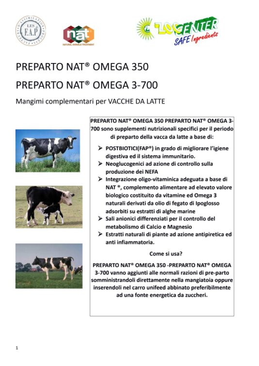 PREPARTO NAT® OMEGA 350 PREPARTO NAT® OMEGA 3- 700 sono supplementi nutrizionali specifici per il periodo di preparto della vacca da latte a base di: