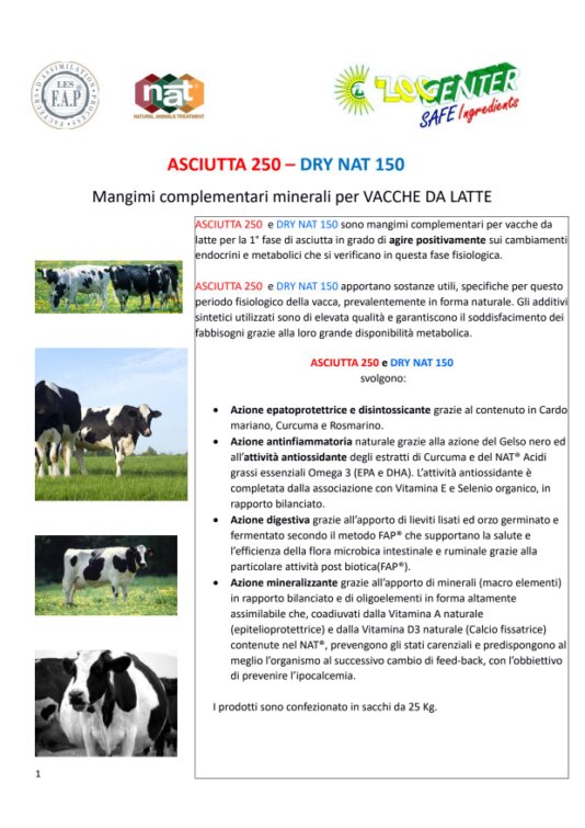 ASCIUTTA 250 e DRY NAT 150 sono mangimi complementari per vacche da latte per la 1° fase di asciutta in grado di agire positivamente sui cambiamenti endocrini e metabolici che si verificano in questa fase fisiologica.